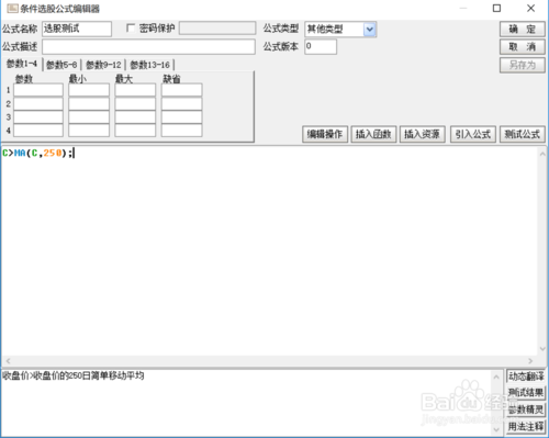 4、然后就可以编辑公式了,我们写一个简单的案例--当日的收盘价大于250日均线,点击确定。