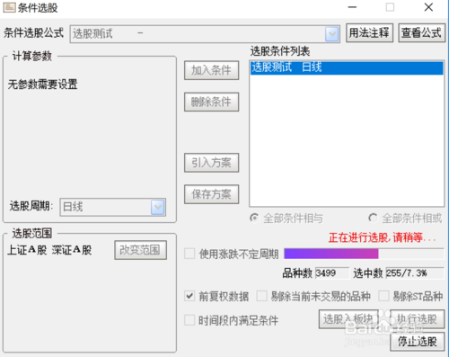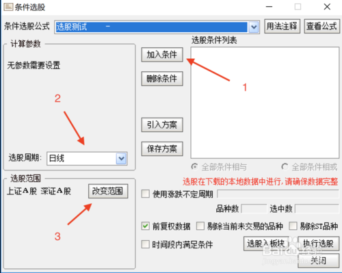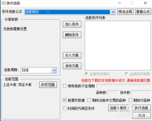 9、点击“加入条件”,然后选择“选股周期”(默认是日线),再选择选股范围(默认是全体上证和深证A股),点击加入条件