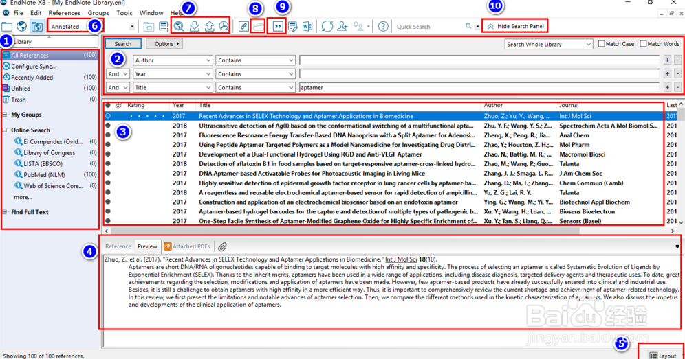 ⑦包括四个常用快捷工具按钮,第一个为在线搜索常用数据库选择;第二个为从文件中导入参考文献到文献数据库中;第三个为从文献数据库中导出参考文献;第四个为查找全文;⑧打开全文,这里是调用外部pdf 阅读器进行阅读,如需使用EndNote X8内置阅读器,点击区域④的“Attached PDFs”即可。注意,这两种阅读模式,文献必须是已经下载了全文,没有全文不能打开查看。⑨将选中的文献记录按照设定的文献格式插入Word 中光标所处位置;⑩隐藏搜索面板快捷按钮