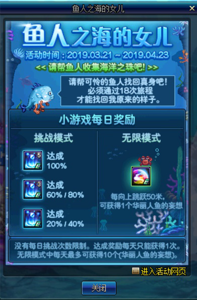 这个模式可以理解为【鱼人之海的女儿】的普通模式,每天没有挑战次数的限制,不过达成奖励每天只能得到一次,也就是说不管每天玩家成功完成多少次【开始挑战】,都只能得到一次的道具奖励,奖励为【海洋之珠】。每天最多可以得到13个【海洋之珠】。
