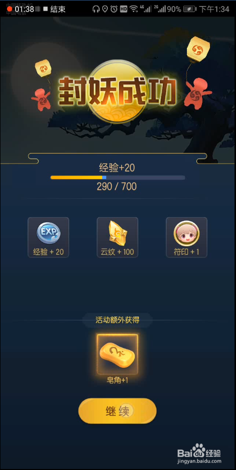 这次,妖怪没有挣扎掉,被我们封妖成功,我们点击下方的继续。