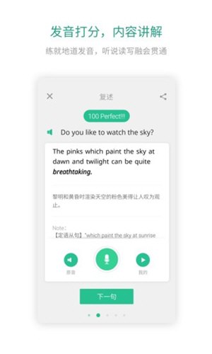 拒绝单一跟读模式,提供逐句中文翻译,让你听音复述。跟读模仿阶段还有智能打分,纠正你的发音错误,让你事半功倍。还可以将你的发音分享给朋友,学习路上不孤单~