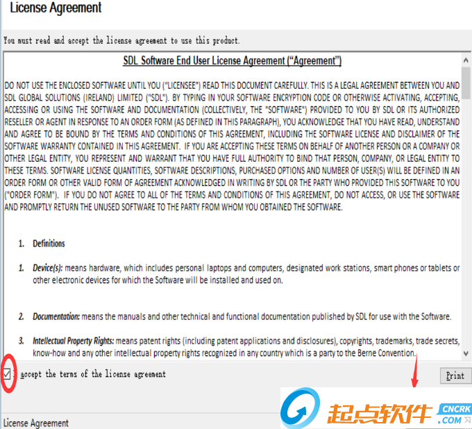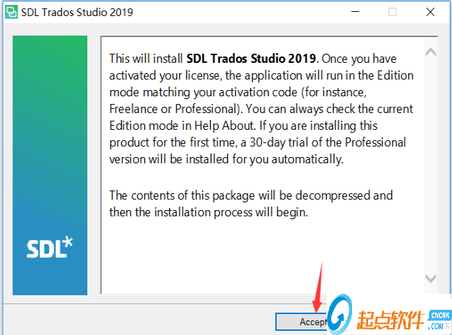 1.首先在起点软件园下载压缩包,解压后双击SDLTradosStudio2019.exe运行,点accept