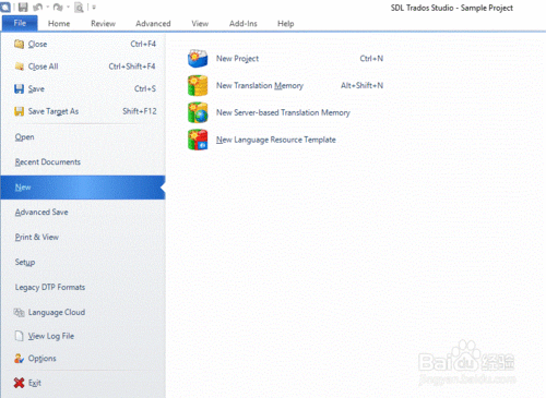 如何在Trados 中创建新翻译任务,术语库&记忆库开启Trados Studio软件,选择“文件(File)”---->“新(New)”---->“新项目(New Project)”。