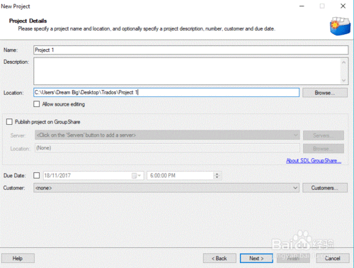 在弹出的“项目细节(Project Details)”中,输入要保存项目的“位置(Location)”,并为项目“命名(Name)”,然后点击“下一步(Next)”。
