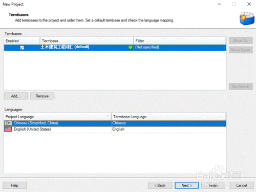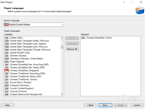 在弹出的“项目语言(Project Language)”中,选择项目的“源语言(Source Language)”及“目标语言(Target Languages)”,点击“添加(Add)”,设定好后,点击“下一步(Next)”。