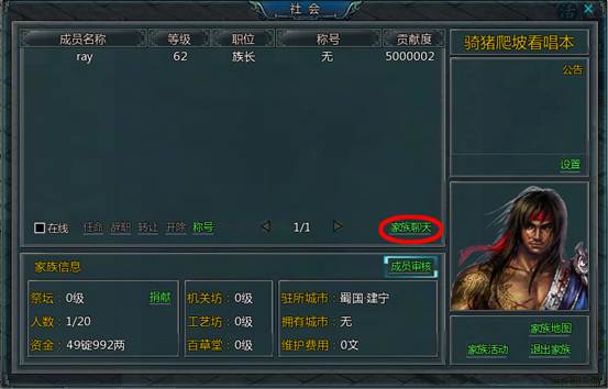 2、可在聊天频道或点击家族界面的“家族聊”天按钮,可进行家族群聊天。