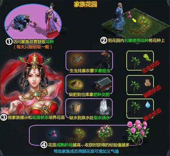 4.家族花园:每个家族成员可在家族地图的家族花园种植自己的花朵。花朵会自动成长,在成长中会出现缺水,生虫,缺肥的状态,如果有人帮忙维护,可以加速成长哦。花朵成熟后收获可获得大量的经验奖励。