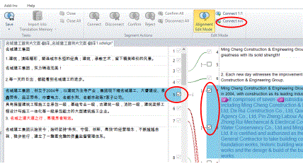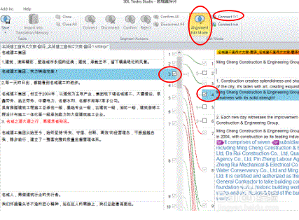 点击“对齐编辑模式(Alignment Edit Mode)”,勾选源文件中的语句及与之相对应的目标文件语句,点击“连接1:1(Connect 1:1)”。再点击“对齐编辑模式(Alignment Edit Mode)”,结束连接编辑。