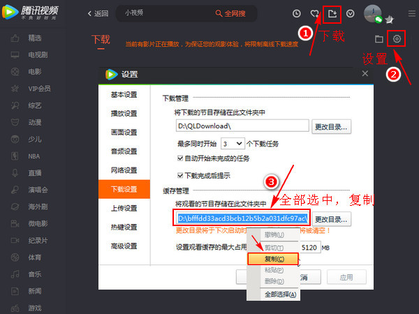 5、视频下载完成后点击腾讯客户端的“下载”按钮,接着在下载界面点击“设置”按钮,然后在弹出的对话框中全部选中并复制“缓存管理”下面的地址。可以右击该地址,在弹出的菜单中选择复制,也可以用快捷键“Ctrl+C”进行复制。和之前上面的操作是一样的。