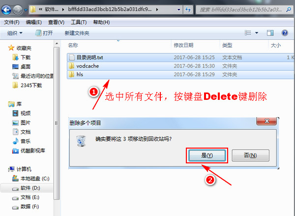 3、现在打开了一个新的界面,该界面显示的就是腾讯视频客户端所有的缓存文件,我们把这些文件全部选中,然后按键盘上面的“Delete”键。这时会弹出一个提示框,我们直接点击“是”。这样就把所有的缓存文件都删除了。