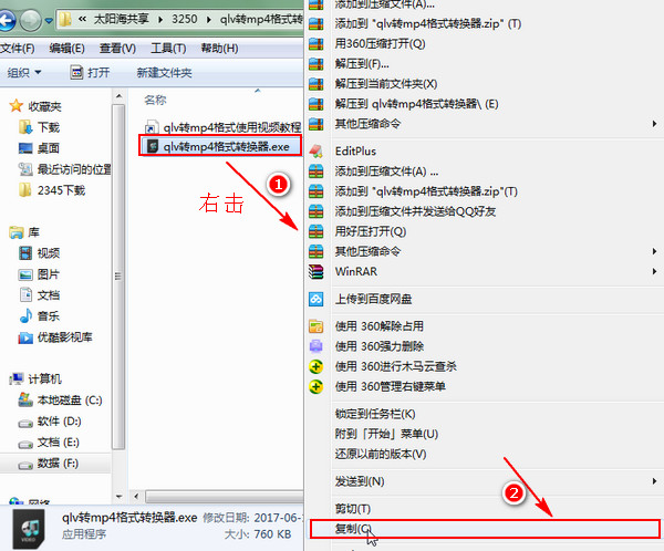 8、现在我们需要把qlv转MP4转换器复制到视频的缓存文件下面,右击qlv转MP4转换器,在弹出的菜单中选择“复制”,也可以用快捷键“Ctrl+C”进行复制。