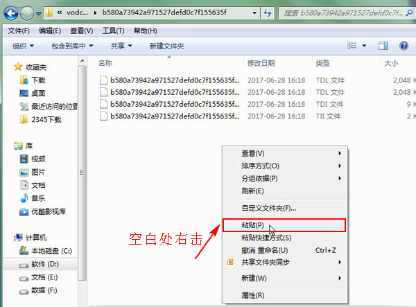 9、复制后回到缓存文件的文件夹下,在界面空白处右击,在弹出的菜单中选择“粘贴”,也可以用快捷键“Ctrl+V”进行粘贴。