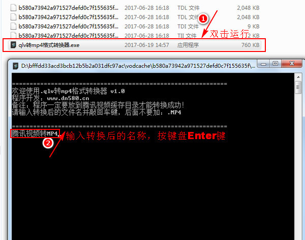 10、粘贴后就会发现在缓存文件下出现了一个qlv转MP4格式转换器,双击运行该应用程序,然后在弹出的界面中输入转换后的视频文件名称,但是文件名称后面不能有.mp4,我这里输入的名称是腾讯转MP4,大家可以自己进行输入,输入好名称后按键盘上面的“Enter”键。