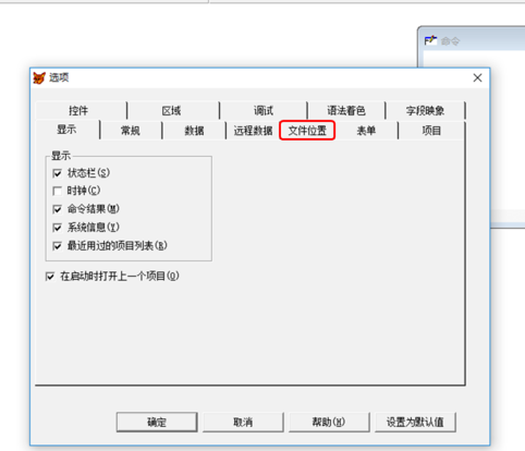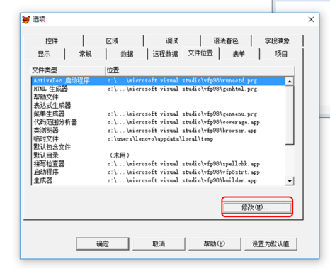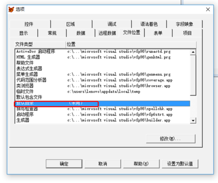 打开vfp程序,选择菜单中的“工具”-“选项”,弹出下面图片。选择“文件位置”页中的“默认目录”,将其改为你需要指定的目录后点击“设为默认值”按钮保存即可。