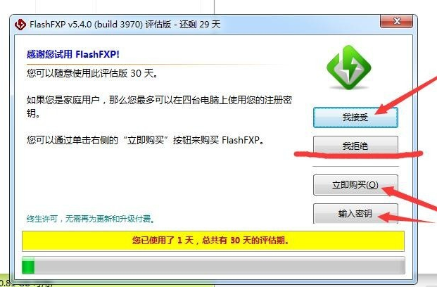 如果直接点“我接受”,就可以使用FlashFXP工具三十天了,如果点击“立即购买”并“输入密钥”是可以永久使用的,如果点击“我拒绝”,FlashFXP工具会自行关闭。