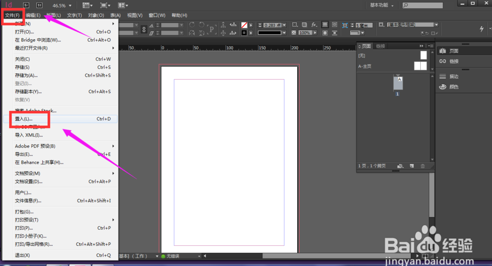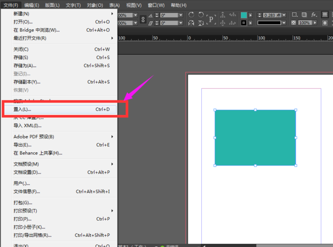 在Indesign中新建立画布后,选择文件菜单中的置入命令,选择需要的图片