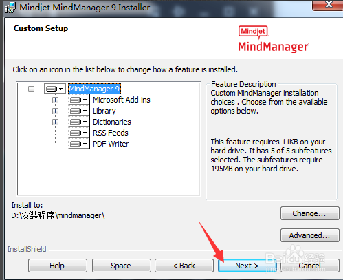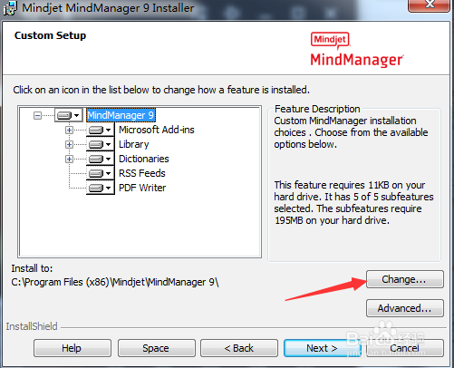 进行custom setup的界面当中,进行点击change来进行选择安装路径位置。