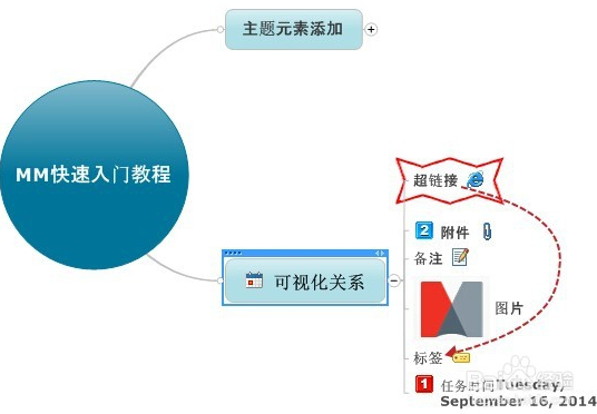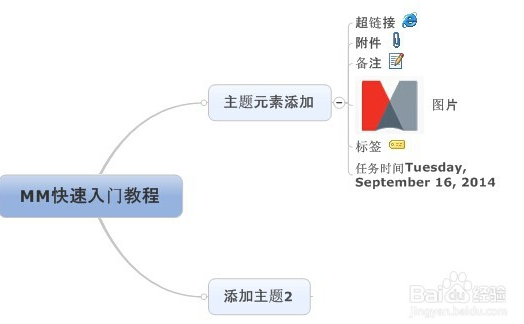 通过菜单插入->主题元素工具,可以为主题添加超链接、附件、备注、图片、标签、提醒以及指定任务信息等信息。
