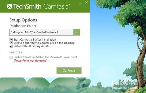 然后在弹出的界面上,选择Camtasia Studio 9的安装路径,默认路径为C:\Program Files\TechSmith\Camtasia 9,可以不用修改,其他组件安装可用默认的勾选项,如下图所示。