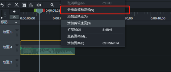 右击视频,选择“分离音频和视频”这个时候就可以看到视频中的音频轨道被分离了出来,选择音频点击删除,这样一来视频中的原声就被删除了。