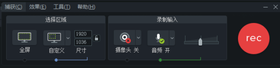 点击文件下方的录制按钮,就会跳出来录制视频的编辑框,在这里你可以选择全屏录制或者自定义屏幕大小。调节录制的声音大小,调整完成之后就可以点击“rec”开始录制。