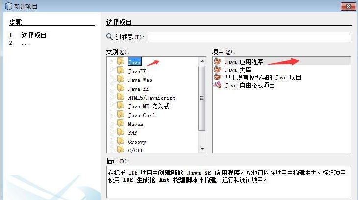 3.在选择项目窗口选择java项目,在项目类型中可以选择应用程序或者是类库