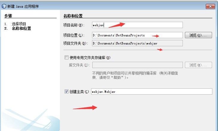 4.填写项目名称及项目位置,并勾选下面的创建主类选项,然后点击完成创建java项目