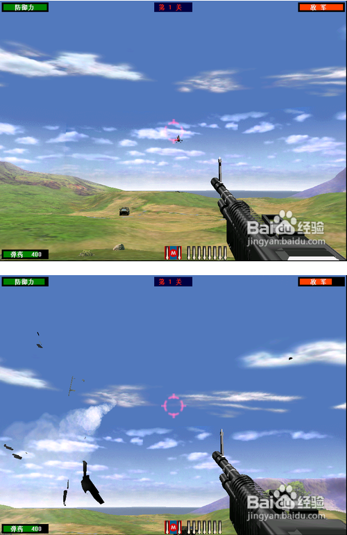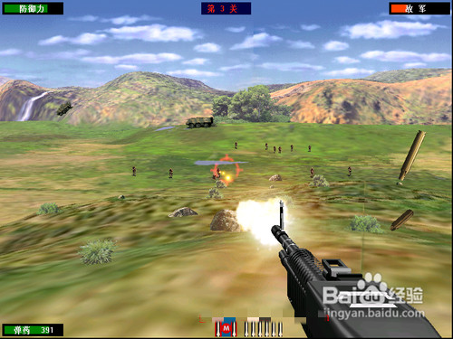 使用机枪射击士兵。 当自己没有干掉运兵战车或者是没有干掉运兵飞机时,就会出现大批量的士兵,会到达一定的射击范围内,向你攻击,尤其是扔手榴弹的,杀伤力很强,因此需要使用机枪射击,点击左键就会发射子弹,再点击不动,慢慢的向士兵身上移动,就可以应用机枪,杀死士兵。