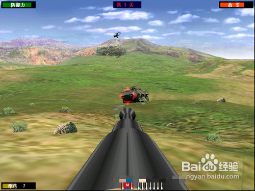 用飞弹消灭飞机。首先说说飞机怎样消灭吧,飞机飞得快一点,它会第一个飞来攻击,放炸弹,所以要先将飞来的飞机炸掉,鼠标瞄准飞机后,按M键发射飞弹,要在飞机迎面来的时候,发射飞弹最有效,离去的时候发射飞弹,不太容易射中。