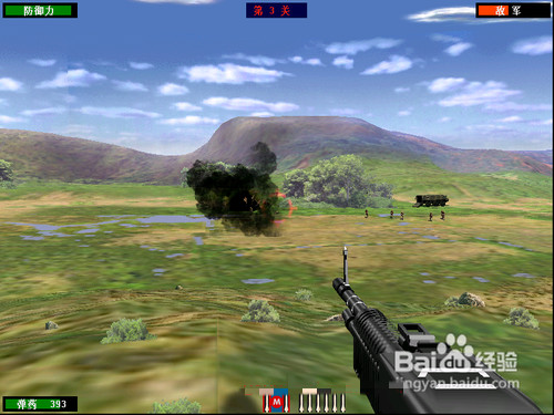机枪射击敌兵。如果运兵车上的兵下来后,就要用机枪射击敌人,瞄准敌人,用鼠标左键点击发射子弹,也可以按住鼠标左键不放,连续发射子弹,同时移动鼠标,将敌人消灭。