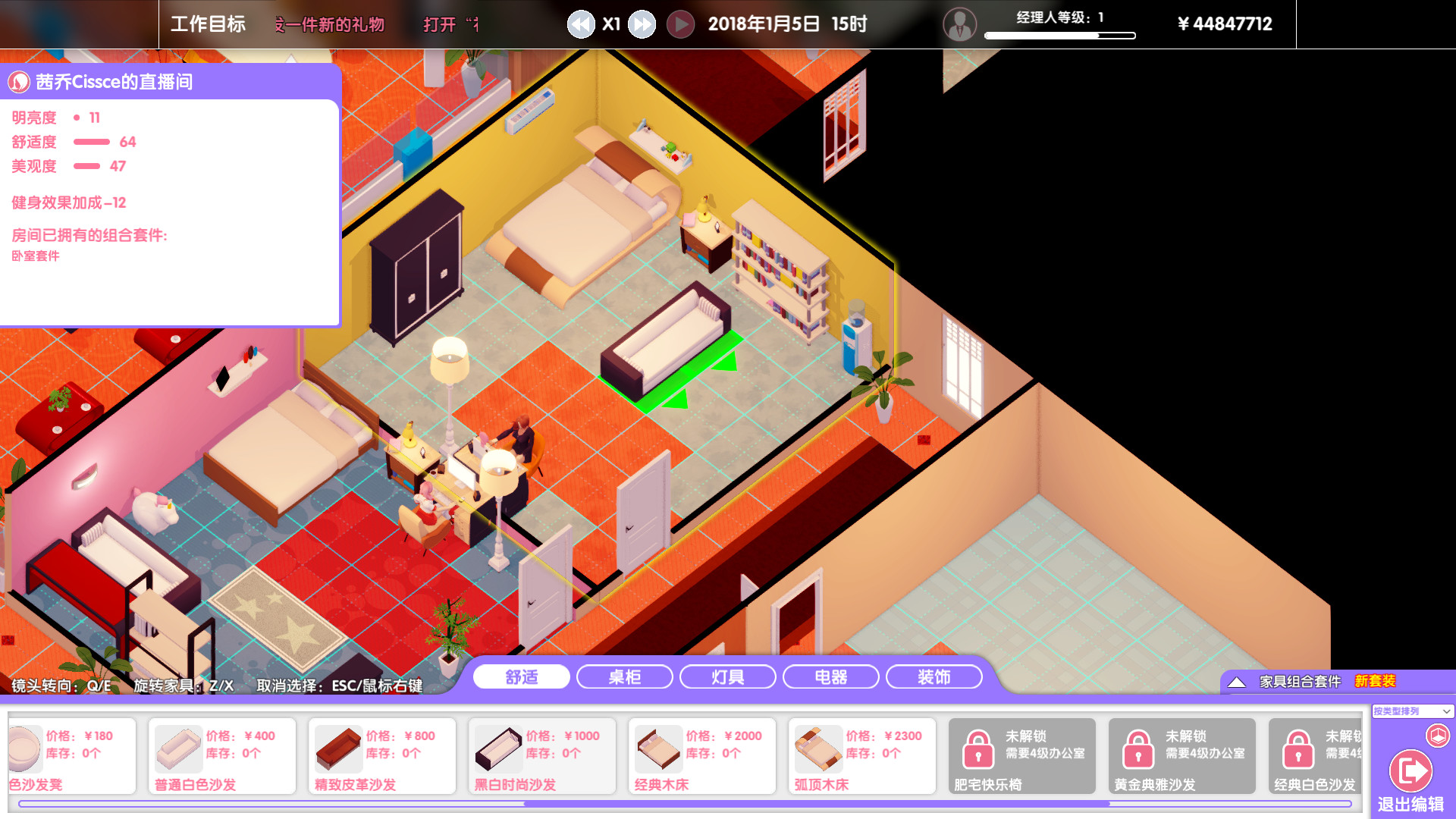 新手技巧分享1、折叠椅大法,游戏里的折叠椅加舒适还加美观,前期摆一个灯,摆一个背景板,其他格子全部放折叠椅,然后你就能省下很多精力,不需要老是喂主播吃巧克力,省下很多操作。