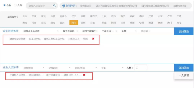 答:选择好资质条件或者人员条件之后,切记要点击“添加到筛选条件”出现图中结果即可。