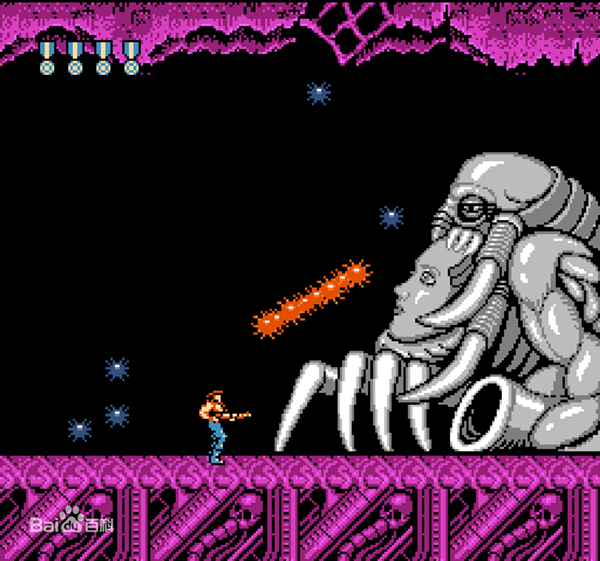 1、游戏的系统与前作基本相同,但有了一点细微改动:前作中由红色猎鹰,表示的武器在本作中全部改以枪表示,部分武器形态也发生变化。比如前作的火焰枪F由旋转小火球变为会发散的大火球。霰弹枪S变成取得一个时一次发射三颗子弹,取得两个时发射五颗。前作中的纵深版面被取消,取而代之的是可向八方向移动、射击的俯视画面。在俯视画面中可以得到令画面内敌人瞬间全灭的炸弹, [1] 发动时机可由玩家决定,这个设定后来被SFC版沿用。游戏难度之于前作大幅度提高,被认为是系列所有作品中最难的之一。2、日版的标题为《超级魂斗罗》,去掉了街机版的副标题“异形的反击”(エイリアンの逆袭),而美版的标题则为“Super C”。欧洲版标题为“Probotector II - Return of the Evil Forces ”,主角与敌人依然是机器人。