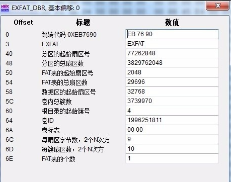 template “EXFAT_DBR”description “EXFAT_DBR|海天数据恢复”sector-alignedbeginhex 3 “跳转代码 0XEB7690”string 5 “EXFAT”move 56int64 “分区的起始扇区号”int64 “分区的总扇区数”uint32 “FAT表的起始扇区号”uint32 “FAT表的总扇区数”uint32 “数据区的起始扇区号”uint32 “卷内总簇数”uint32 “根目录的起始簇号”uint32 “卷ID”move 2hex 2 “卷标志”uint8 “每扇区字节数,2个N次方”uint8 “每簇扇区数,2个N次方”uint8 “FAT表的个数”end