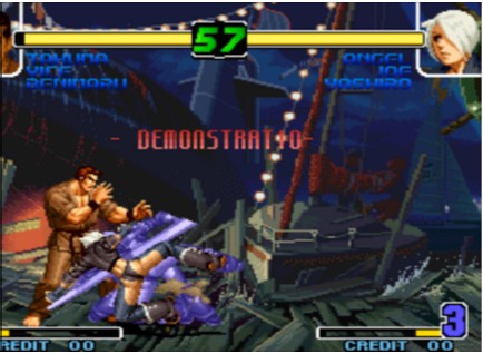 相信全国绝大多数玩家是从KOF95开始接触KOF的。本作已经是相当成熟的作品了,但其实她最大的贡献却是八神庵(IORI YAGAMI)的出场。作为草稚京永远的敌人,红色的头发,前卫的服饰,潇洒的动作,青紫色的火焰,强劲的实力,离奇的身世,以及他那深入人心的著名的“三段笑”都是FANS津津乐道的话题。他那三下有力的“葵花”多么象他对命运的重锤!他那华丽的“八稚女”多么象对宿命的控诉!!!一时间,大街上到处是各种各样的八神!可以说,八神是KOF的象征,也是SNK的标志!即使后来超级酷哥K’的出场也不能撼动他的地位!也因此,八神理所当然地当选为当年GAMEST大赏的“最佳角色赏”。