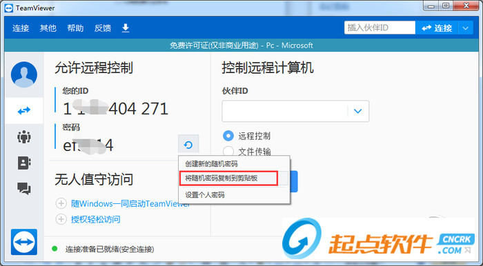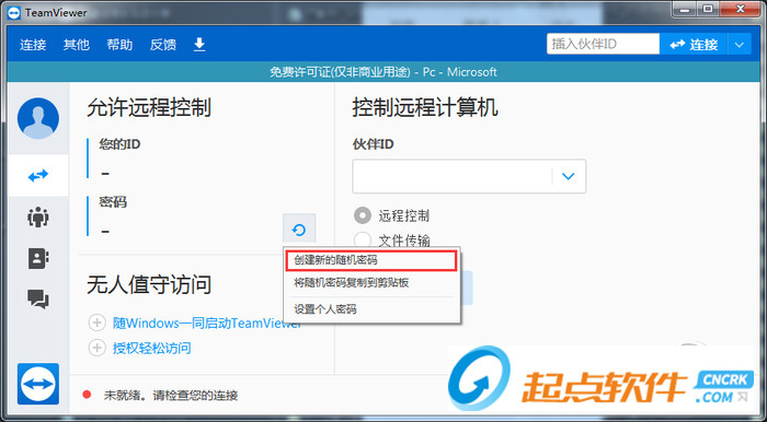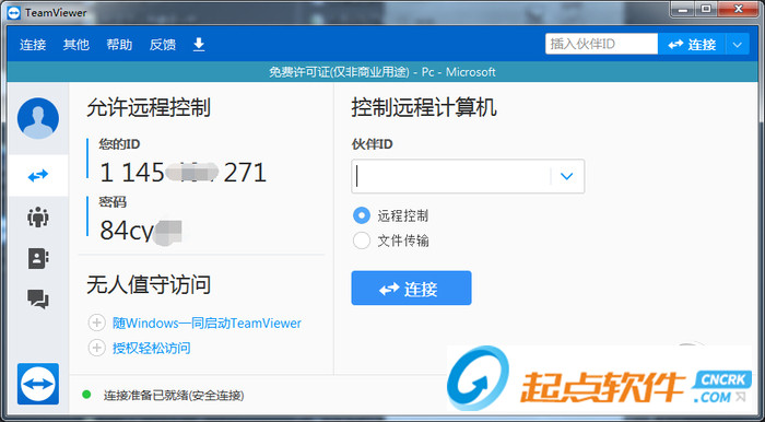 1、进行teamviewer绿色版进行连接时,需先保证两台要连接的计算机是启动状态的。2、在两台计算机上同时运行teamviewer绿色版(无需安装),软件第一次启动后会自动生成伙伴ID,记住这个id。双方可以通过电话,或者网络聊天软件,或者记录等各种方式得到对方电脑的ID号和密码。