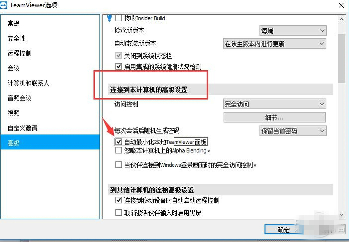 3、拖到下方找到连接到本计算机的高级设置,并把自动最小化的选项勾上。
