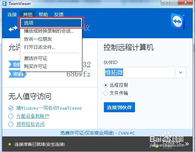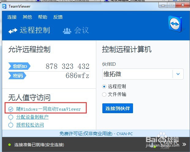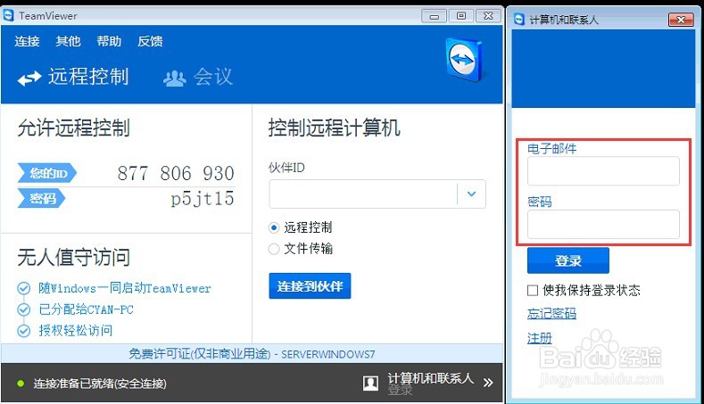 3、在另一台计算机中的teamviewer绿色版,并输入原计算机的伙伴ID,点击链接,输入密码即可建立连接。不过要记得创建teamviewer账户才行哦。