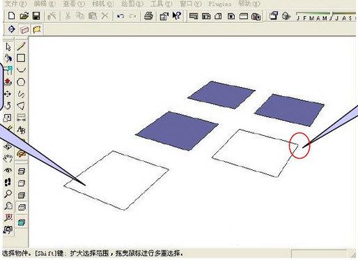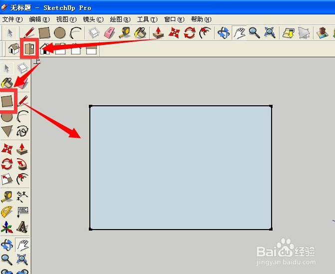 打开sketchup8.0在顶视图下点击矩形工具 绘制一个矩形 并设置尺寸 效果及步骤如下箭头所示