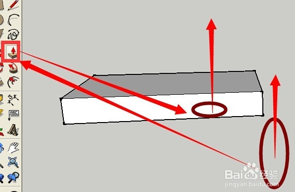 按住鼠标滚轮 向上拖动界面 使得变成透视图效果 点按推拉工具 向上拖出高度 并设置高度 按回车结束 方法步骤如下箭头所示