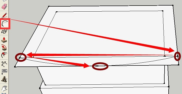 用圆弧工具先后点按箭头所示的两点 然后在单击最后一个箭头所示的位置 形成一个圆弧 效果如下图所示
