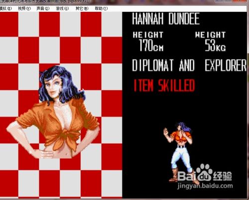 汉娜·邓迪 身高:170公分; 体重:53公斤; 身份:外交家兼冒险家。长发披肩,身穿红上衣白裤子。跑动中用膝盖攻击敌人腹部,跳跃中用脚攻击敌人。绝招是旋风脚。