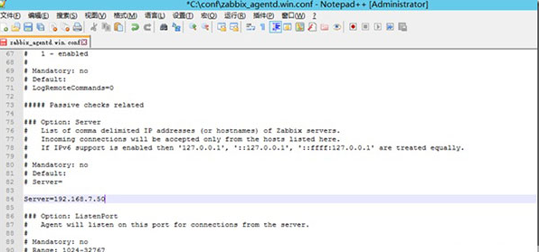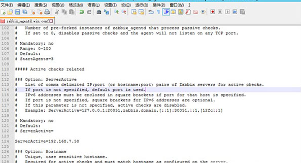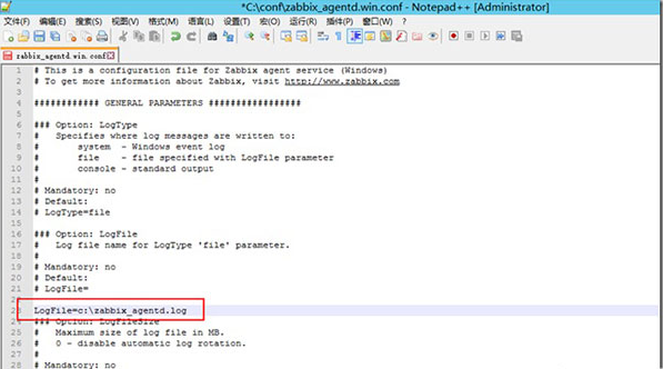 2、找到conf下的配置文件zabbix_agentd.win.conf ,修改LogFile、Server、ServerActive、Hostname这四个参数。具体配置如下: