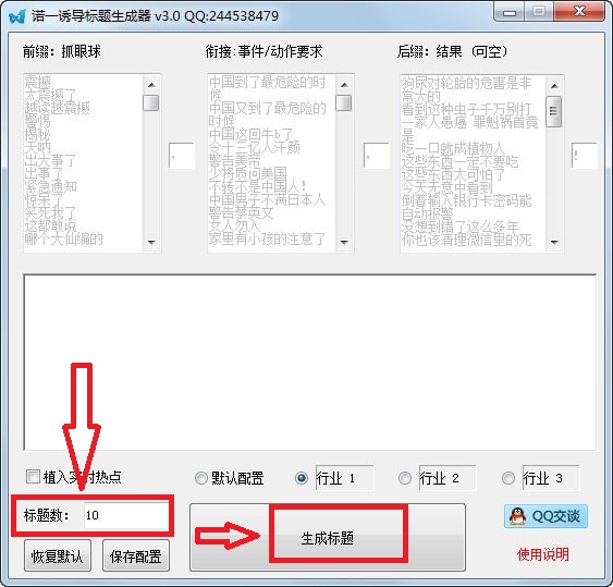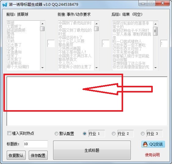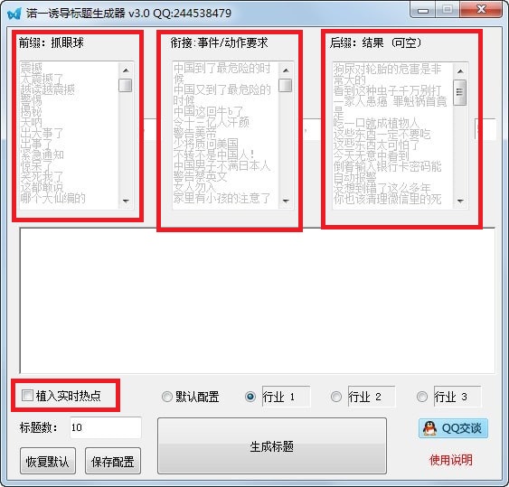 可自定义文章前缀、衔接事件动作、后缀结果,可实时植入当前热点,比较适合自媒体标题。