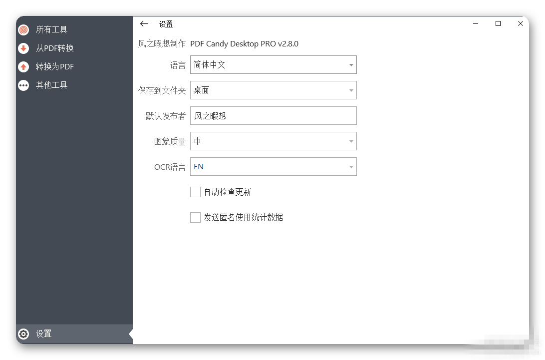 PDF Candy Desktop是由Icecream出品的一款简单易用,功能强大的PDF转换编辑器,中文名称可称作:糖果PDF转换编辑器。它使您能够将PDF文件转换为各种支持的格式(从PDF到DOC,PDF到JPG等),将文档,电子书和图像转换为PDF,合并PDF,分割PDF,提取图像和文本从PDF,编辑PDF元数据,保护PDF和解锁密码保护的PDF文件。