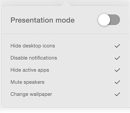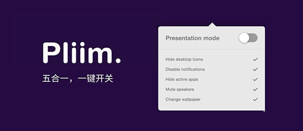 Pillm Mac版集合了 5 个必不可少,又十分常用的小开关。隐藏所有桌面图标,禁用系统通知,隐藏已打开的程序,静音,改变壁纸为默认黑色(可自定义)。可单选,也可以多选。Pillm Mac版的几个小功能看起来非常适合想要截图、录屏的时候使用,用来展示一个干净、整洁的 macOS 界面,非常的实用。