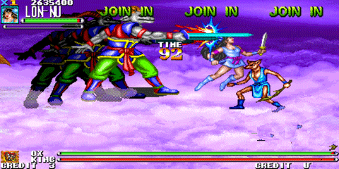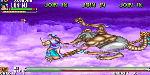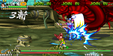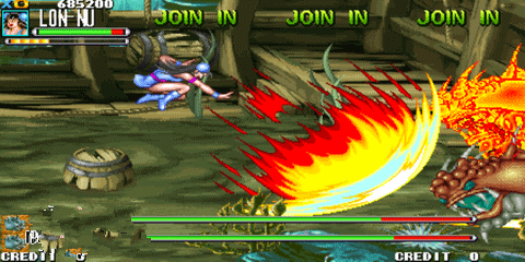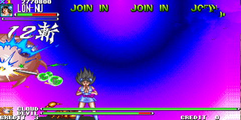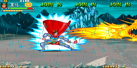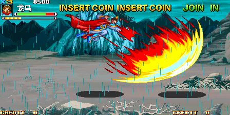 2、升龙斩:→↓↘+A 需要第二档气,(属于跳起动作可连翻腾舞和混元功),打BOSS的必背招,背后可能有漏洞,必要时可连接翻腾舞(本人打通关之后才知道升龙斩的用法),每用一次位置下移一点,最适合在角落使用。