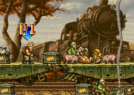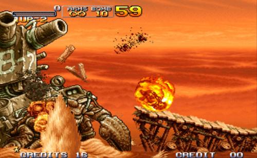 合金弹头(Metal Slug)本作之主要角色,编号为SV001(Super Vehicle-001),主炮为130mm口径加农炮,副炮为12.7mm重机枪,威力同H枪,射速慢於H枪,可进行360°全方位射击。中弹时会有受伤摇头硬直动作,除被高空掉落物击中外可抵抗3次攻击,人物不在车内时受到高空掉落物攻击照样会损毁。破关时位於BOSS场景时额外奖励10000分。