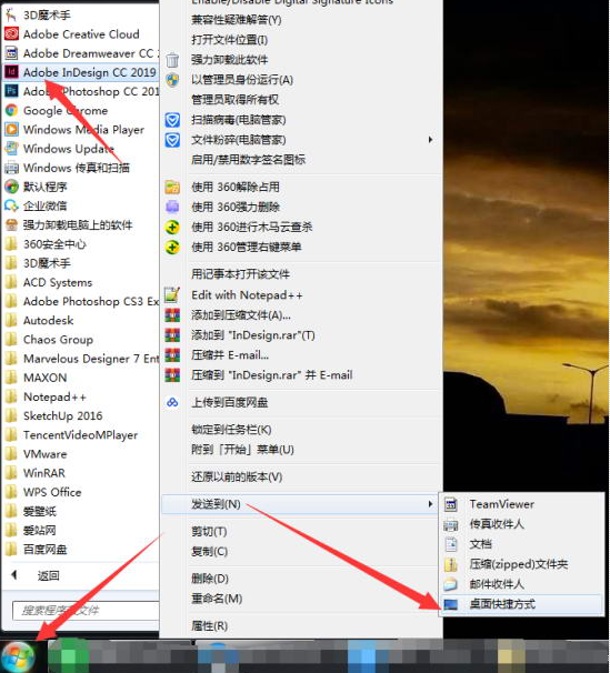 第六步:点击电脑开始菜单,找到ID2019右击发送到桌面快捷方式。